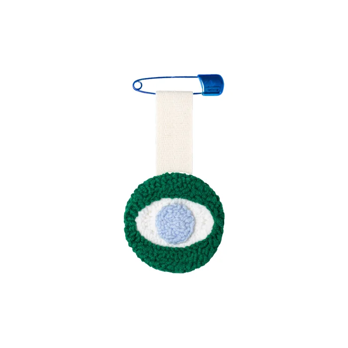 Medallion with a diameter of 5.5 cm, consisting of a velvet hanger and a safety pin in matching colors, produced with the punch technique.