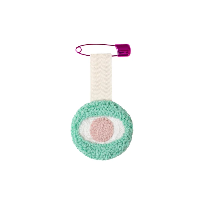 Medallion with a diameter of 5.5 cm, consisting of a velvet hanger and a safety pin in matching colors, produced with the punch technique.