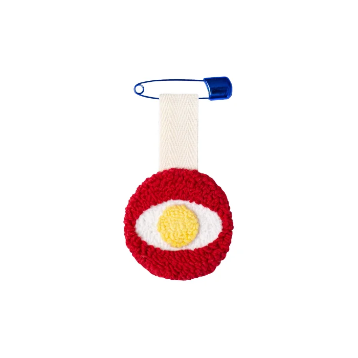 Medallion with a diameter of 5.5 cm, consisting of a velvet hanger and a safety pin in matching colors, produced with the punch technique.