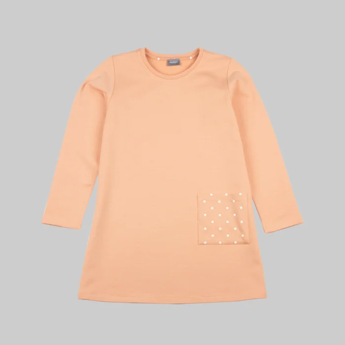 Long sleeve girly dress, a-line fit, has a small single front pocket.