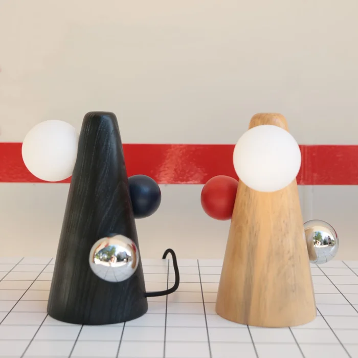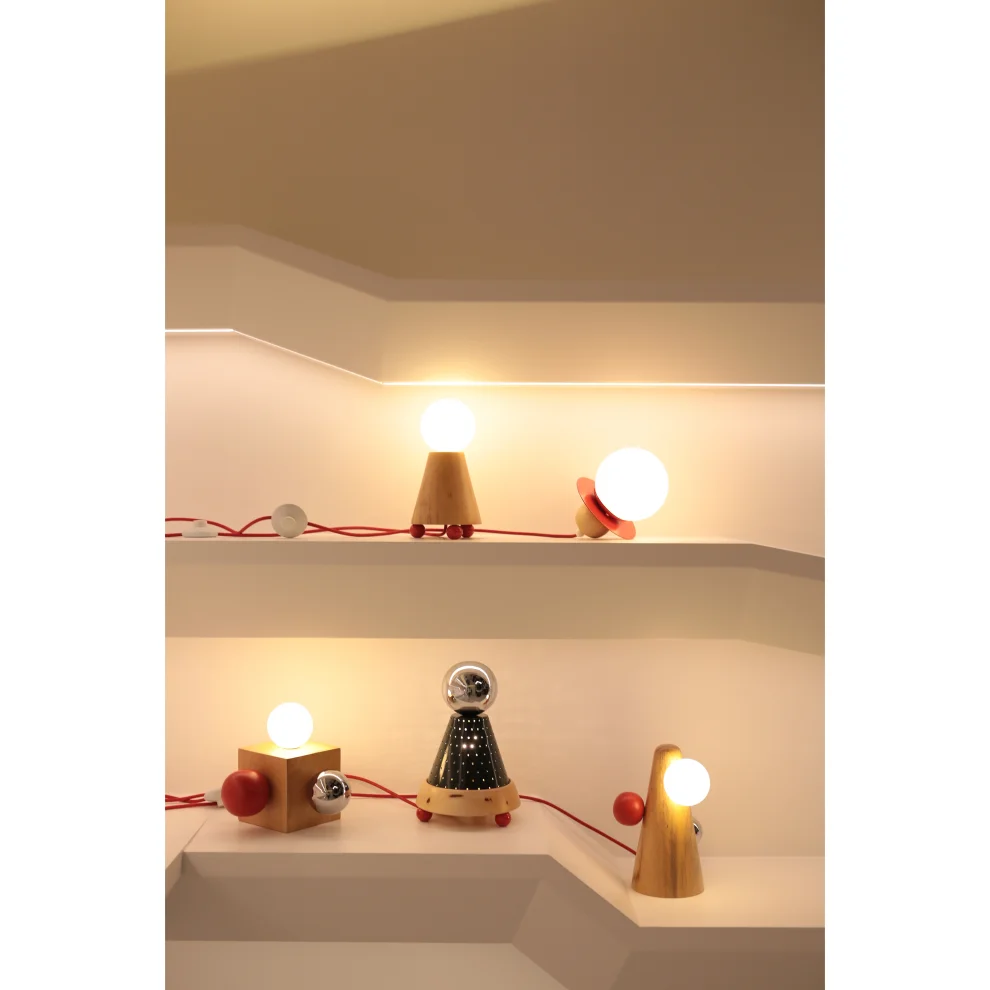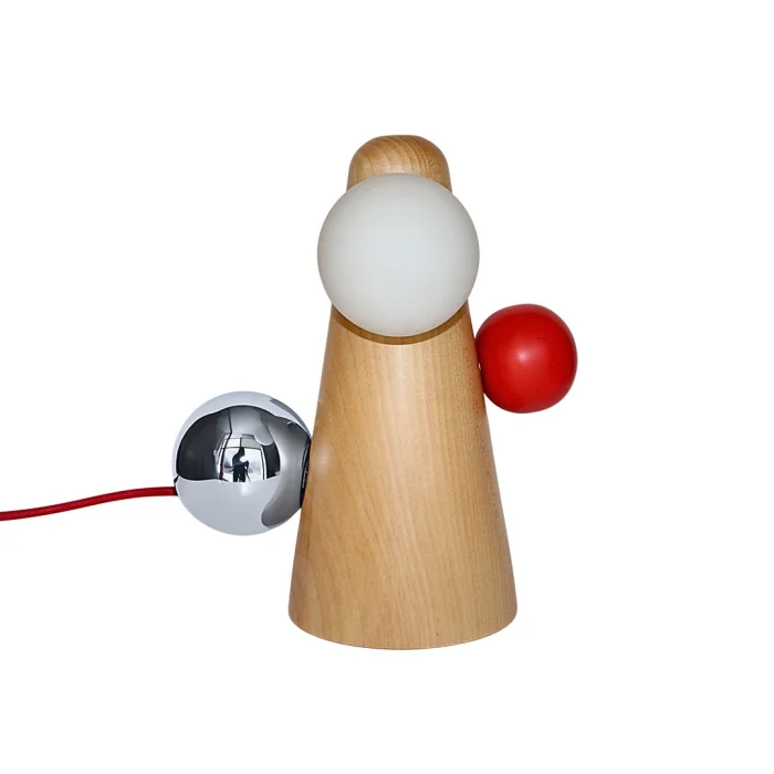 Solid wood body, Red lacquered globe, Chrome globe, Opal glass, Braided cable.