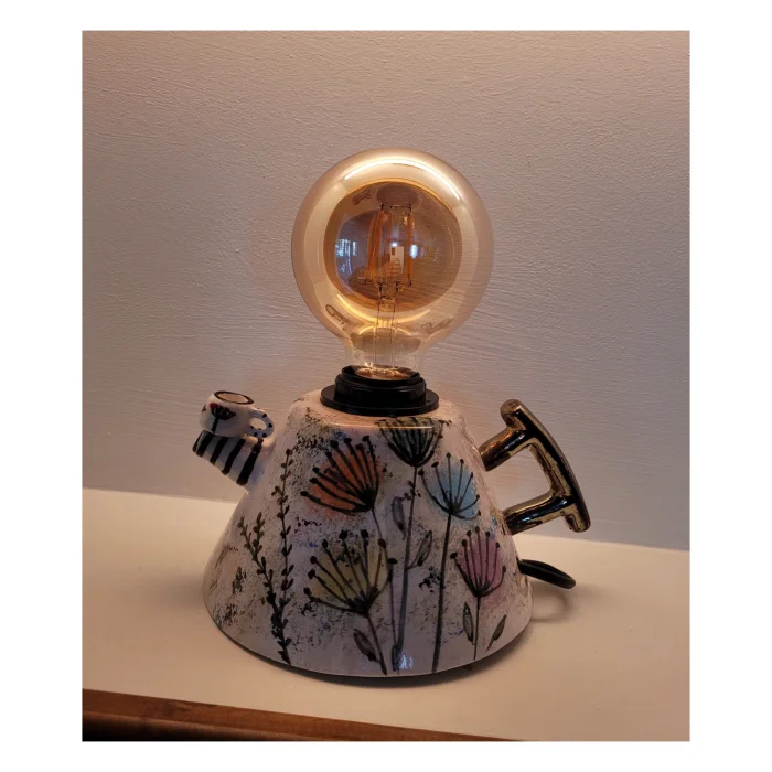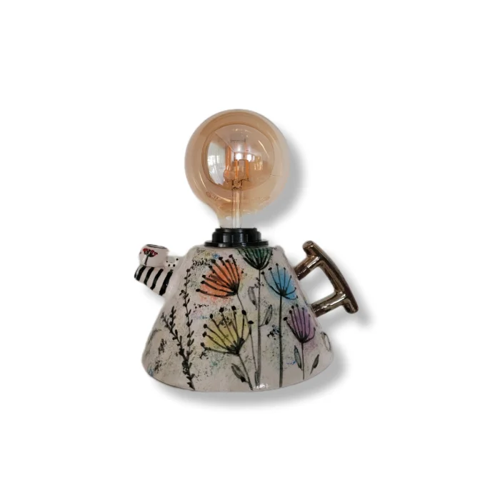 Teapot formed,  floral  patterned  handbuilding and hand-painted, ceramic table, bedside lamp, decorative lighting object.