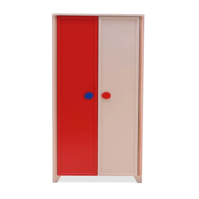 The inner volume of this two-door wardrobe is designed as 2 drawers, 1 shelf and 1 hanger. Red water-based lacquer was applied to one of the drawers.