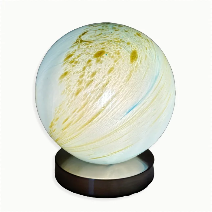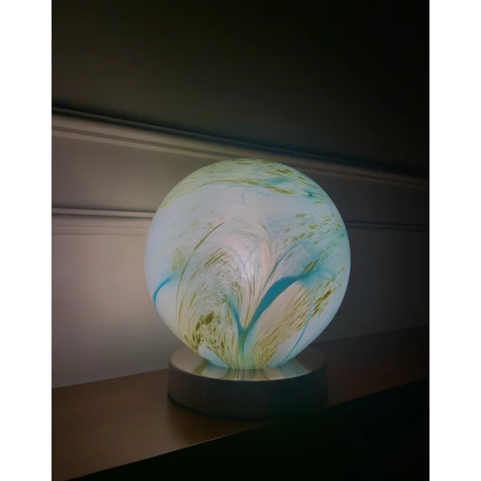 Mouth blown glass in baby blue and green finished with silver brass. Each piece is unique. Works with E14 lightbulb.