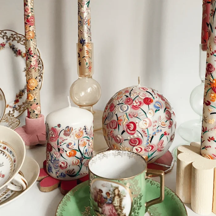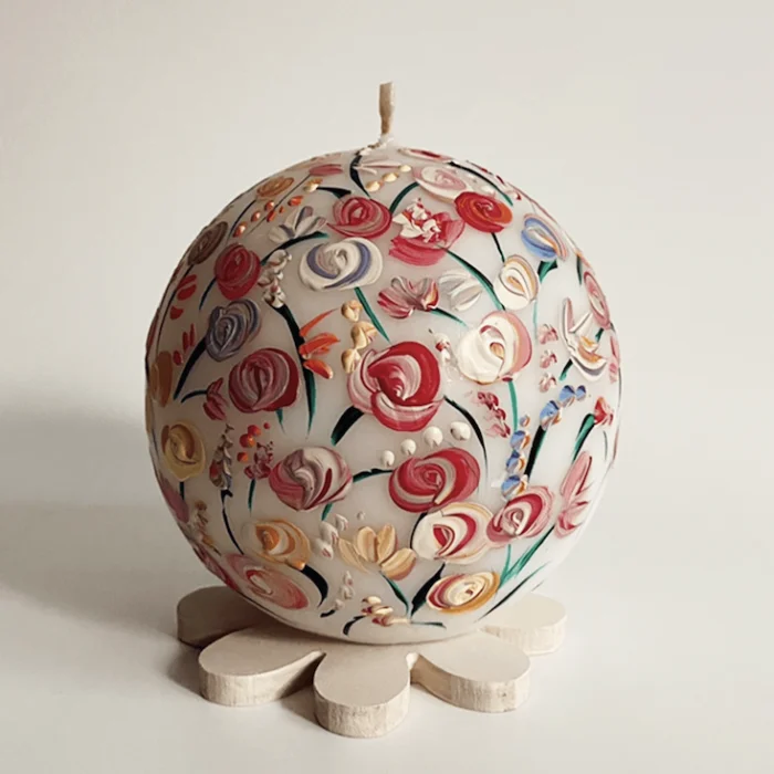 It is hand-painted and patterned on a spherical candle made of 100% Soy wax.