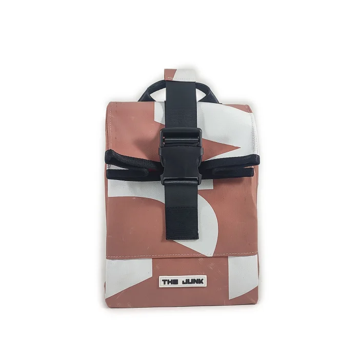 Product Features Adjustable backpack with customizable size. 1 interior pocket and 1 zippered back pocket. Water-resistant with logo detail. Made from up-cycled and sustainable materials. Material Up-cycled truck tarpaulin and seatbelt. Size Minimum: 24x13x28 cm, 9 L Maximum: 24x13x42 cm, 13 L Product Details 100% handcrafted. Unique, one-of-a-kind design