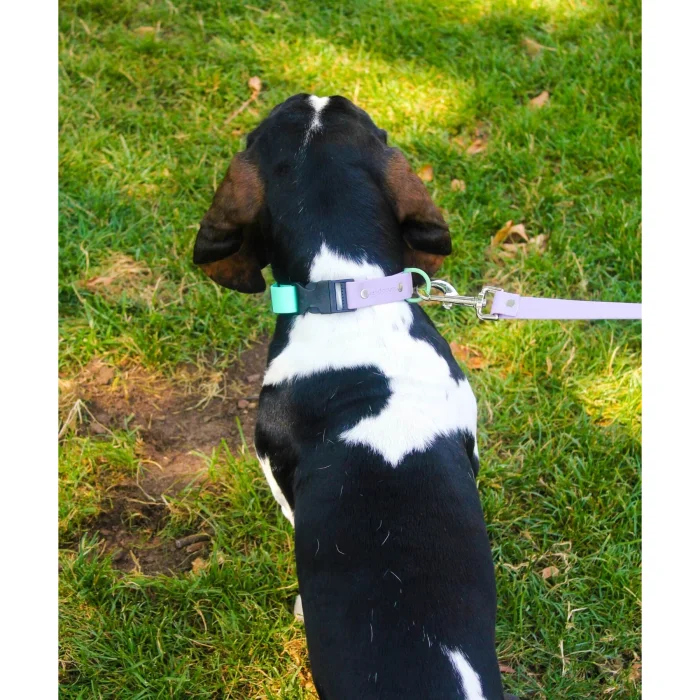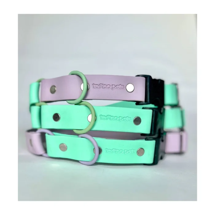 waterproof; It does not hold dirt and odor; Neck collar made of Biothane, a material that is so durable that even if your dog wants to shred it, it cannot shred; It is a material specially produced for dogs and horses and is not harmful to animal health. ; No animal ingredients are used, it is vegan friendly. ; You can easily adjust the collars according to your dog's chest from 2 separate parts thanks to the adjustment buckle. ; Available in 2 sizes S, M and L. You can see the measurements from the size chart. ; The model in the photo wears a size Jean Paul M. ; Its width is 2.5 cm. ; There are 2 color options, plain mint green color and lilac color. In both colors, the top of the collar is baby blue. ; * The products are handmade, there may be slight deviations in the dimensions. **There may be slight deviations in colors due to light.
