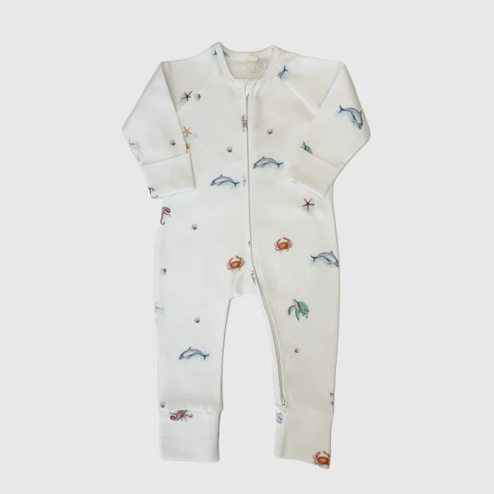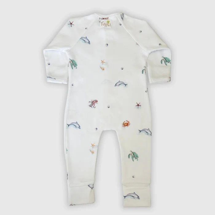 Tuuli Kids organic jumpsuits will always be among your baby's clothes from the time he leaves the hospital until 24 months. Our baby jumpsuit, made of 100% organic cotton fabric, will be indispensable for you with its comfort and ease of wearing and taking off. Made from 100% organic cotton fabric. Our product is GOTS Organic Certified. It consists of one product containing a ocean animal patterned jumpsuit. Our baby jumpsuit with booties helps you maintain your baby's body temperature. You can use our booties by turning them from the foot part. Our jumpsuits can also be used without booties. The front body has a two-way zipper. Reverse zipper helps keep little ones' arms and abdomen warm during diaper changes. There is a security strip at the zipper head to protect the delicate skin of the little ones. All our products are produced by considering the supply chain in accordance with the principle of sustainability. No chemicals that could harm your baby are used in the raw materials and production process of our products. Organic baby clothes do not contain any unnatural substances such as bleach and chemical dyes. It does not create an allergy risk. Organic baby clothing products are friendly not only to your baby but also to the environment.