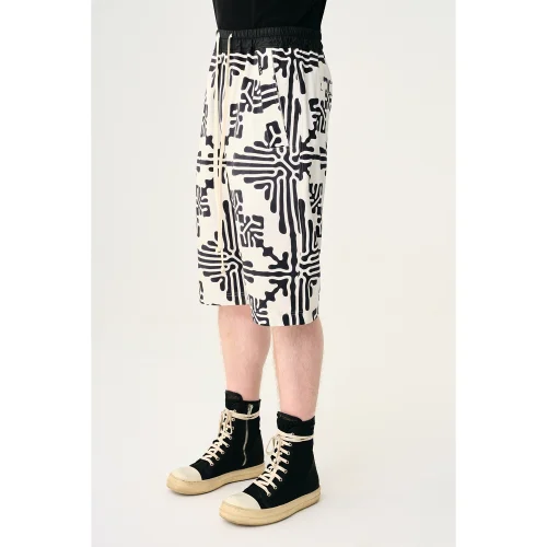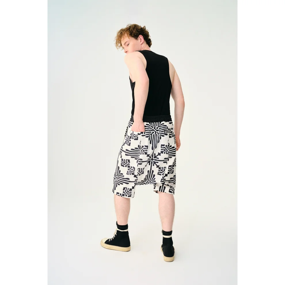 Unisex shorts are designed in sizes S/M and L/XL. It is produced using gabardine fabric woven from 100% natural fibers. The model has body measurements of 90/70/90, is 185 cm tall and wears a size L/XL.
