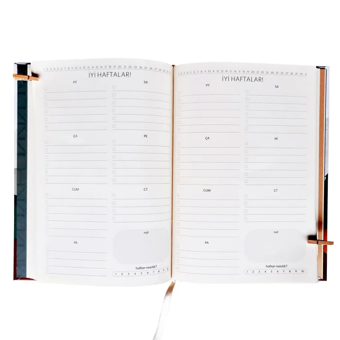 12-month and 52-week planning pages 224 pages Its pages can be opened fully. More than half of the notebook is empty pages so you can personalize it Hard cover Made of 80gr Ivory paper Important days for Turkey, nature calendar, seasonal foods are available. In addition, there are song suggestions and routine follow-up charts for each month.