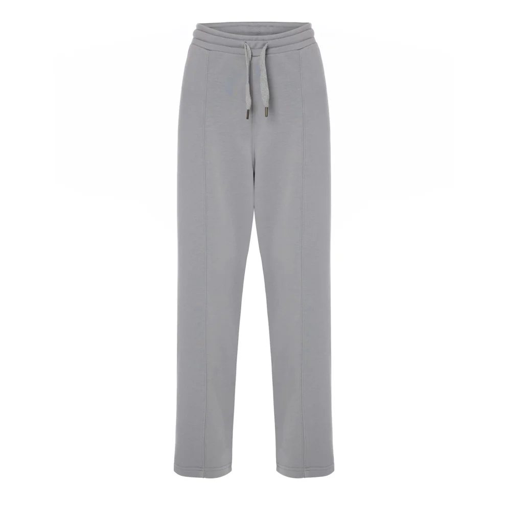 - Gray - lilac colored, loose cut and full length jogging trousers.