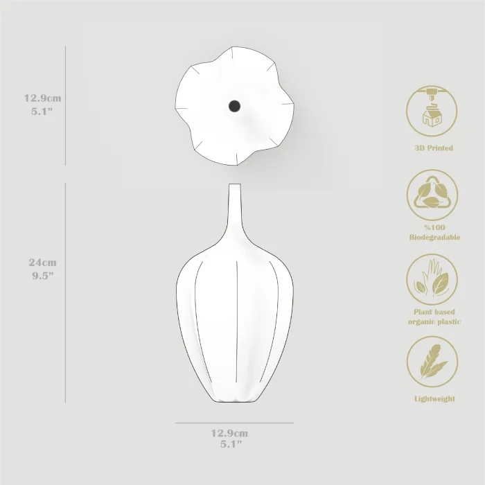 Product Features: Design : Scandinavian minimalist style Height : 24cm Material : High-quality PLA bioplastic made from renewable plant sources Color : Cream Dimensions : 24cm height, 12.9cm width, 12.9cm depth Use : Perfect for displaying flowers, greenery, or as a standalone decorative piece Style : Modern, minimalist, and elegant Key Benefits : Eco-Friendly Material : Made from PLA bioplastic, a renewable and biodegradable material Handcrafted Quality : Each vase is meticulously handmade, ensuring a unique and high-quality product Versatile Use : Suitable for a variety of decorative purposes Perfect Gift : Ideal for housewarming parties, weddings, or any special occasion Transform your home with a sophisticated piece with this Scandinavian-inspired vase. Whether used to hold fresh flowers, greenery, or as a stylish decor item on its own, it’s a versatile and chic addition to any interior space. Order today and add a touch of minimalist elegance to your space.