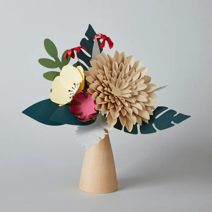 Measurements Diameter of the bouquet: approximately 8″ (20 cm) Height in total: 9″ (23 cm) Height of the vase: 4.5″ (11 cm) Diameter of the flowers: varies from 2″ to 5″ (5 to 15 cm) Materials The paper we choose to work with is 160-300 gsm. The paper pulp is the same color as the surface, so the line along the cuts are not white. The vases come from local forests and are shaped by our local carpenter. Sustainability Compared to other materials, wood and paper based goods produced in a sustainable manner are more environment-friendly. They come from a renewable resource and are recyclable. Also the papers we use are FSC, PEFC and ECF certified, coming from environmentally conscious, sustainable forests. Why prefer our paper flowers? Our paper flower bouquets are long lasting and unique gifts for yourself and your loved ones. These artisanal bouquets are everlasting gifts for mother’s day, birthday, valentine’s day, anniversary, housewarming or a new job celebration. It is also the perfect gift for allergy sufferers or get well soon flowers for patients and newborns in hospitals. Paper flowers are also an eco friendly and easy maintenance choice compared to fresh flowers. How do we do it? Every single detail is designed by A! Ne Hoş team. The templates, paper flowers and wooden vases are designed by A! Ne Hoş. All the flowers are hand made, attached to wire and gathered as a bouquet with floral tape. We collaborate with women who have to stay home to take care of their children. Thus, they have a chance to earn money by working from home.