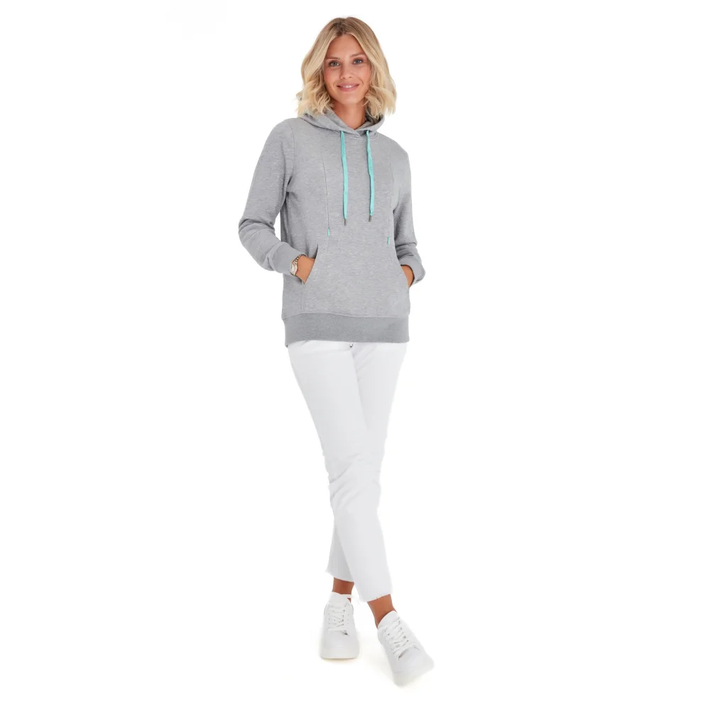 This sweatshirt, which is designed so that Accouchée women who love to dress sportily and comfortably can maintain their style during breastfeeding, pampers you with its soft texture. Thanks to the hidden zippers on both chest lines, you can reach your chest quickly and easily. If you open the zipper only enough to remove the chest during use, your baby's head will close the opening, so you can breastfeed even at the most crowded table without going inside, and you will not fall behind in social life.