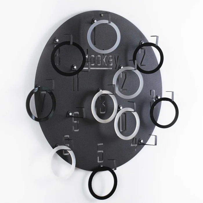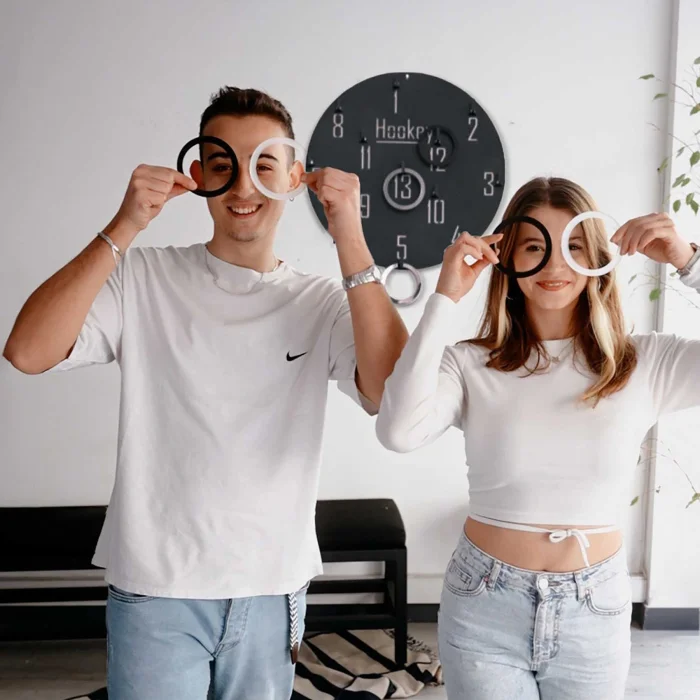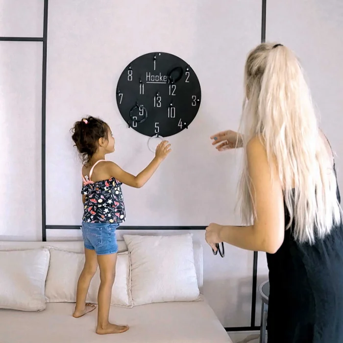 The objective is to toss the rings and have them land on the hooks to score points based on the values of the hooks.