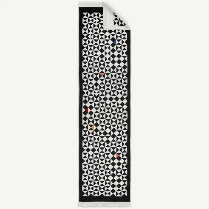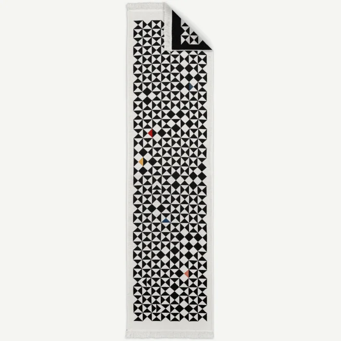 Cross Minor Flat Weave Mid Century Rug Black Geometric Retro Area Accent Runner Rug Designer : Uğur Şayan Machine-woven reversible rug from recycled cotton. Reversible design. Its Vegan, by the way :) Rugs are in this collection; made with recycled cotton, natural cotton and fibers. Origin - Turkey This product is a Retrospektif™ group product.