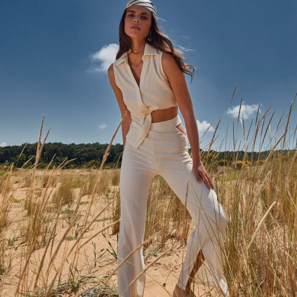 Trousers with Crepe Effect Fabric, Window Detail at Waist, Elastic Waist and Slit Legs