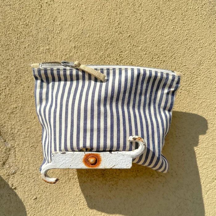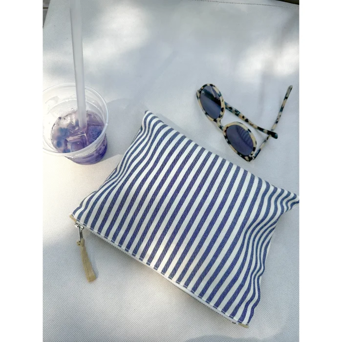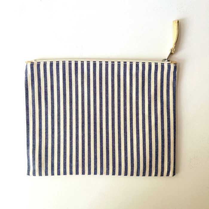 It has stripes on the outside, soft yellow linen lining on the inside and 1 pocket