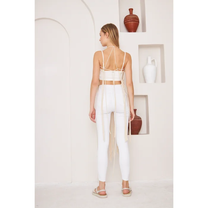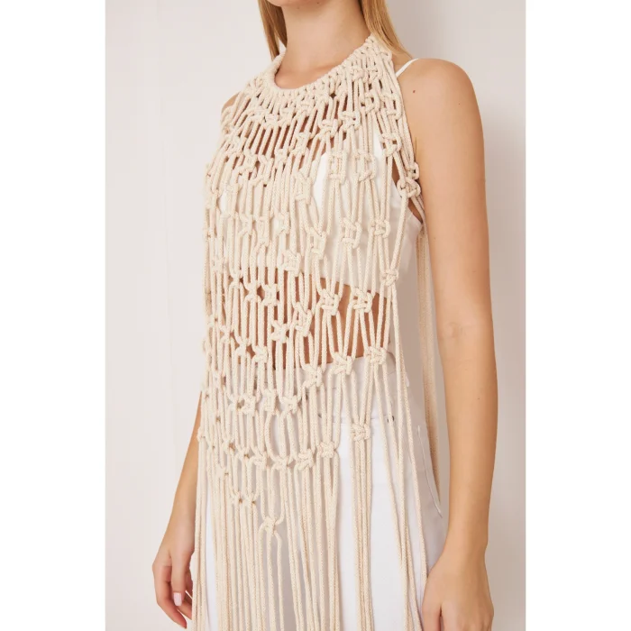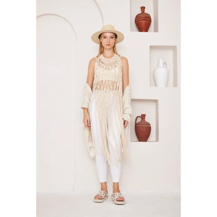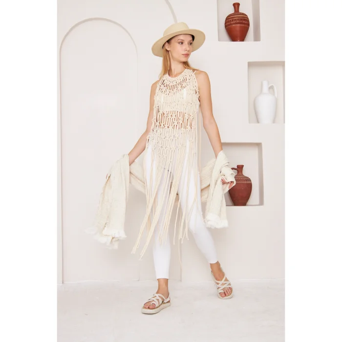 Discover the craftsmanship and elegance of the Sandy Handmade Macramé Boho Dress. This unique piece is made from 100% organic Turkish cotton and uses the fine macramé knotting technique. It can be used as both a blouse and a pareo, making it perfect for beach days or casual wear. Its light white and natural shades can be easily combined with a variety of undergarments. Product Details: Title: Sandy Handmade Macramé Bohemian Dress Type: Dress Categories: Pareo, Beach Dress, Sun Dress, Macramé Dress Fabric: 100% Organic Turkish Cotton; Handwoven Macramé Style: Bohemian, Boho, Boho Chic, Minimalist, Casual Colors: Light White, Natural Mold: Loose Cut Occasion: Holiday Wear, Casual, Festival, Spring, Summer, Casual Use Design Details: Handwoven macramé, backless, open back, necktie, sleeveless