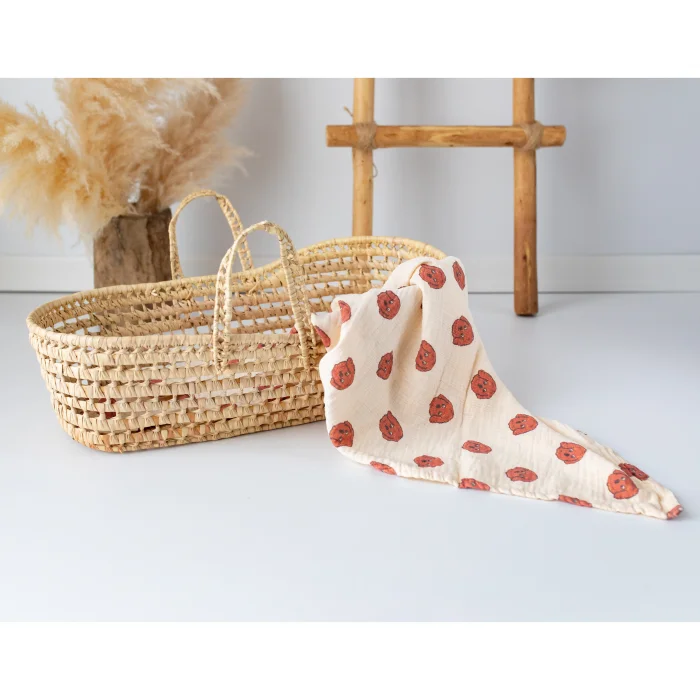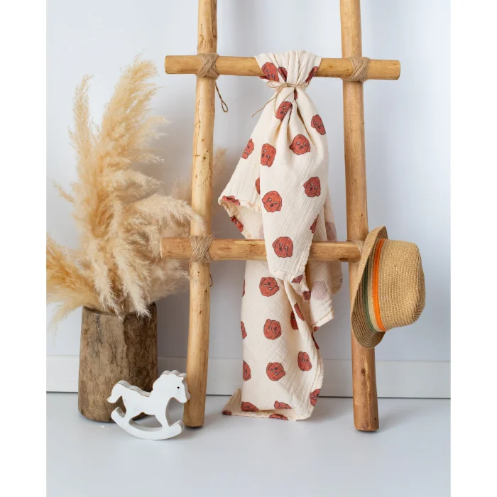 It is made of 100% cotton fabric. Organic dyes are used. It is GOTS certified. It is doubly muslin. Patterns are special design. It measures 100x100 cm.