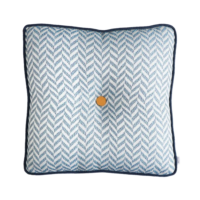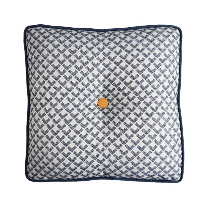 Self-patterned, navy blue corduroy, decorative pillow with orange buttons and legs.