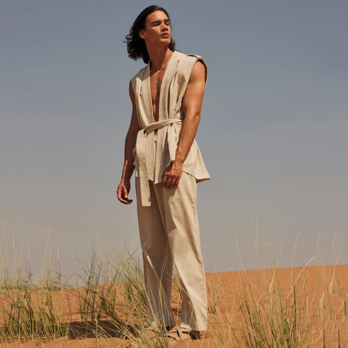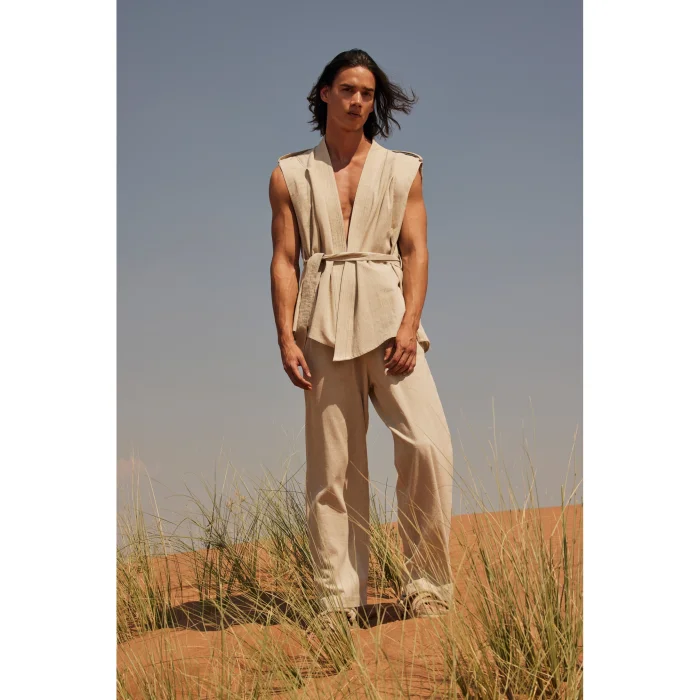 Kimono:-Oversized ,-%100 linen fabric, -Belted, tied from the front, -Wrap front, -Pleated front and back, -Shoulder epaulettes \\Pant:-Pleated front, 100% linen fabric, -Wide leg, -High waisted, -Hook and button closure with a concealed zip and a tab, -Two side pockets,-A welt pocket at the back