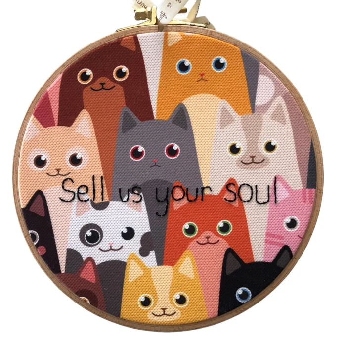 “Sell us your soul” hand embroidered hoop board on color printing. Size information: 20 cm