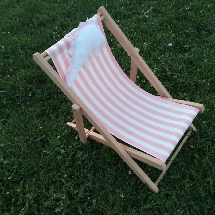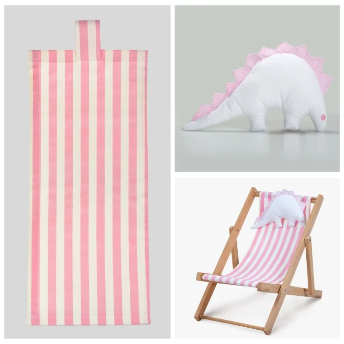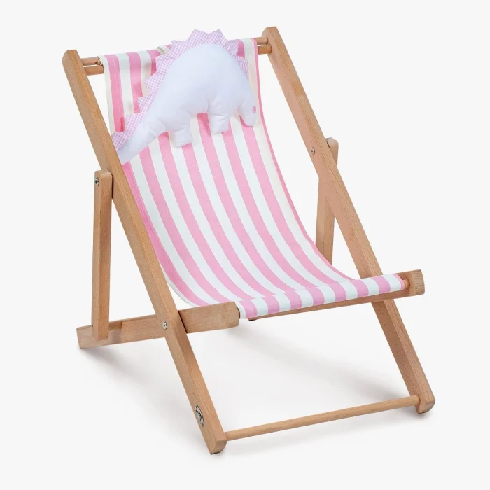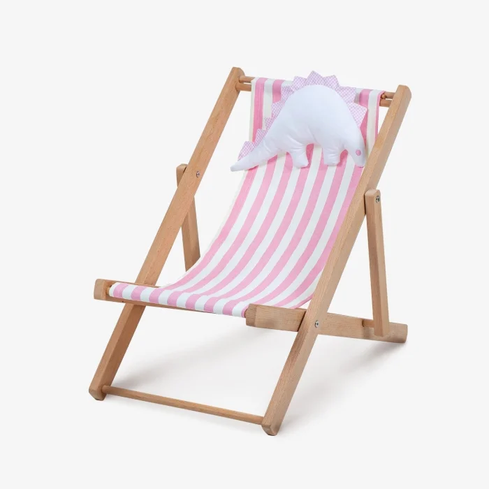 • Two-stage solid wood fun natural children's lounge chair. Includes a dino pillow toy and a pink-and-white striped cushion.