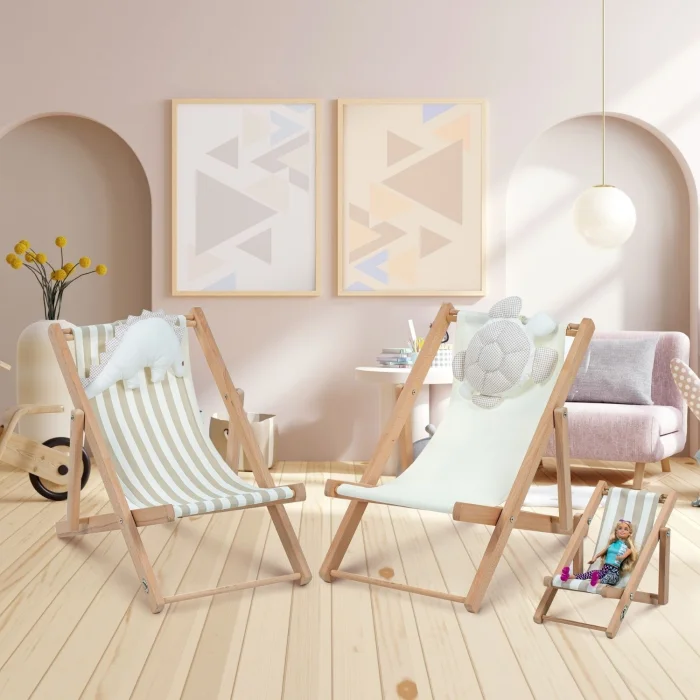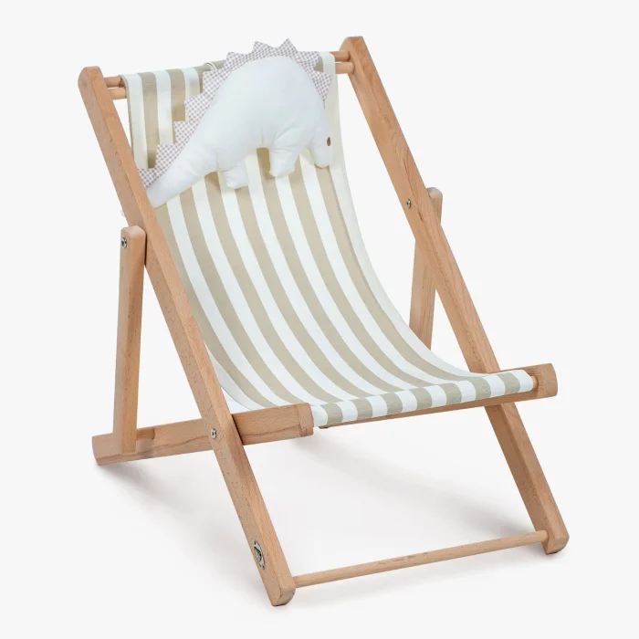 • Two-stage solid wood fun natural children's lounge chair. Includes a dino pillow toy and a pink-and-white striped cushion.