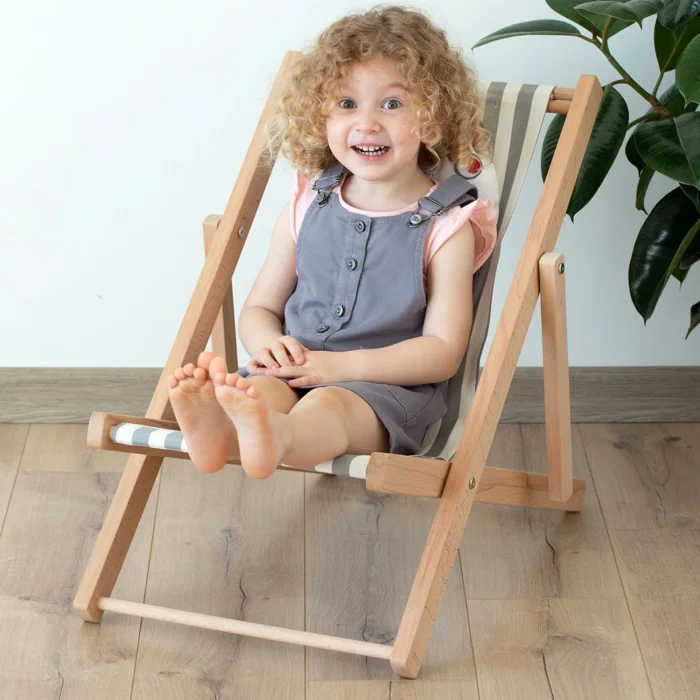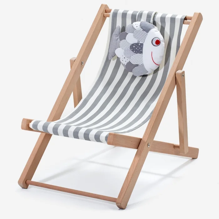 Two-stage solid wood fun natural child lounge seat. A fish pillow and a grey-and-white striped cushion are included. You can use our children's chair in both ways, reclining backwards and upright in a sitting position. Open-Close & Disassembled-Mounted. It is an easy-to-carry, practical sunbed type long chair. Mobile furniture, I go everywhere with you. I'm with you at home, at school, on vacation. Natural solid wood child seat frame size, 42.5*64.5*h:59cm. Actual weight 2,7Kgr. Parcel weight 3,8Kgr.Fiber filled Fish pillow, grey and white sequined, cotton thread hand embroidery felt eye. Fish pillow toy size, Width 27cm. Height 24cm. Depth 10cm. and 110gr. weight. Child seat cushion grey/white striped - interior upholstery fabric details: Lenght 91,5* Width 32cm./111gr.Product: Natural Wooden Child Seat