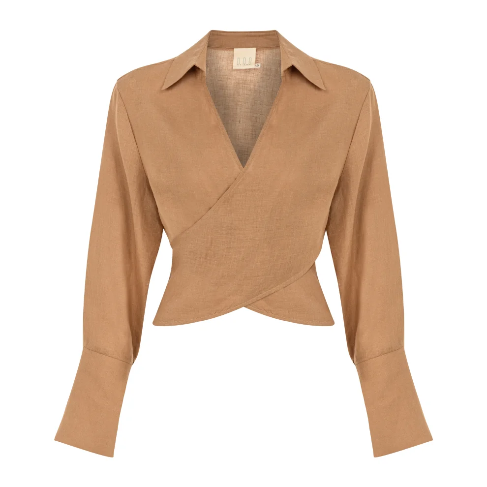 V neck wrap shirt, button fastening at back waist, cutout at waist, 100% Belgian Linen, Model Size: S - Height:176 cm, Bust: 81 cm, Waist:64 cm, Hips: 89 cm