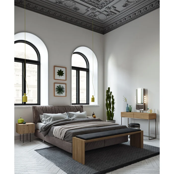 Lola happens to be a bliss of makeup space through its uncomplicated and practical design. It comes equipped with an illuminated and revolving mirror, two drawers.  With its exquisite lacquered surfaces and brass plated legs, Lola raises the standarts for preparation.