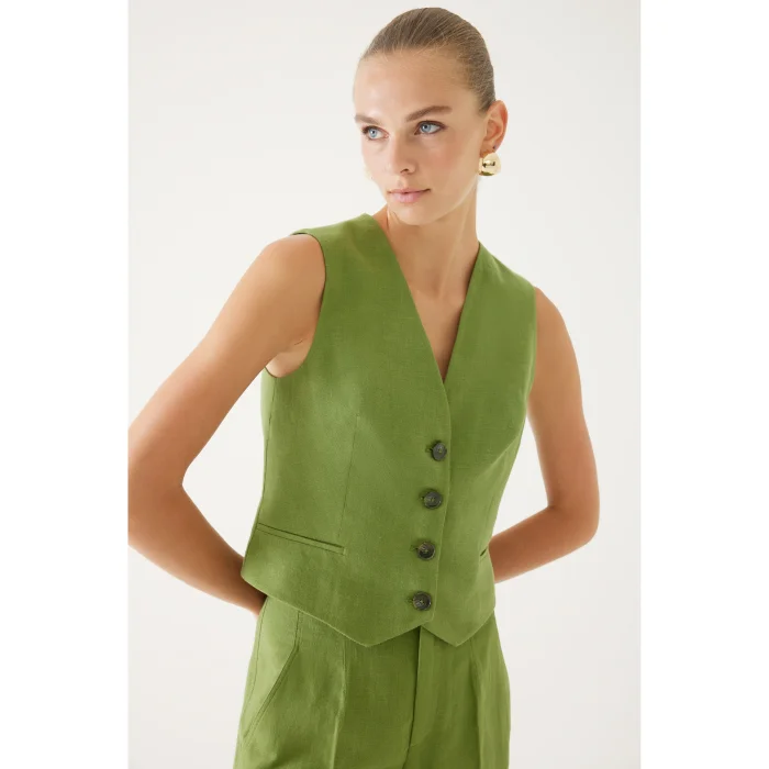 You can combine this pistachio green linen summer vest in different ways. You can get a casual look with t-shirts or shirts, and you can combine it with shirts or blouses for a more elegant style and choose it on special occasions.