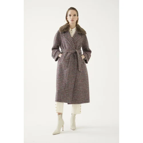 The long-cut, patterned fur coat model is ideal for those who want to take an iconic stance. The belt detail at the waist and on the edges of the arms adds a different touch. You can choose this coat model to capture a stylish accent in trousers and skirt combinations. The fabric texture containing cotton and wool makes you feel warm on cold days.