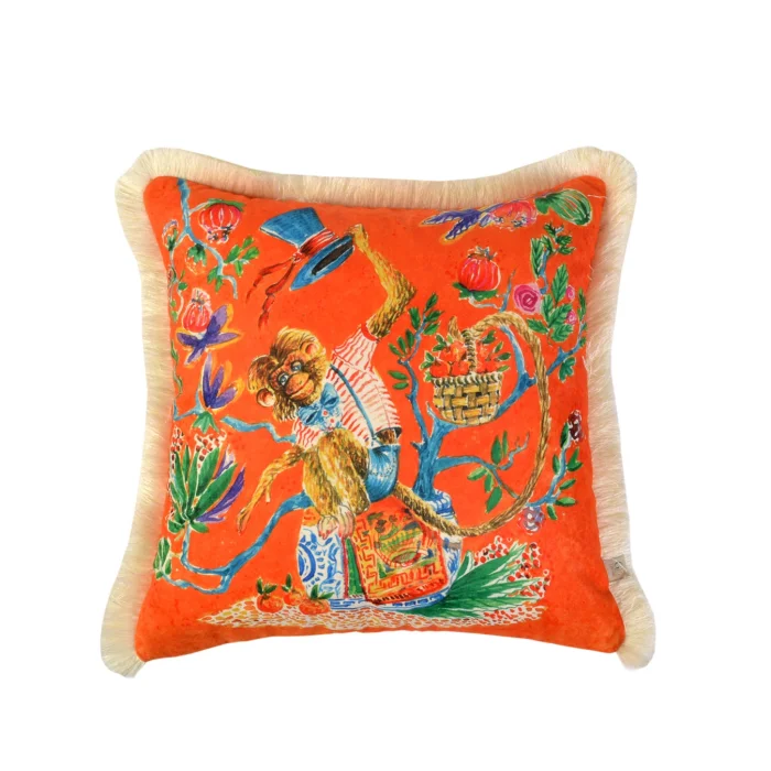 - Decorative Monkey Patterned Orange Velvet Pillow Cover ( 45 x 45 ) Model and Design are reserved by GE Living. Double Sided Pillow - The back of our covers can be used as solid colorCreamTasselsThis product contains pillowcases only. Pillow inside not includedOur pillowcases come in gift wrapping