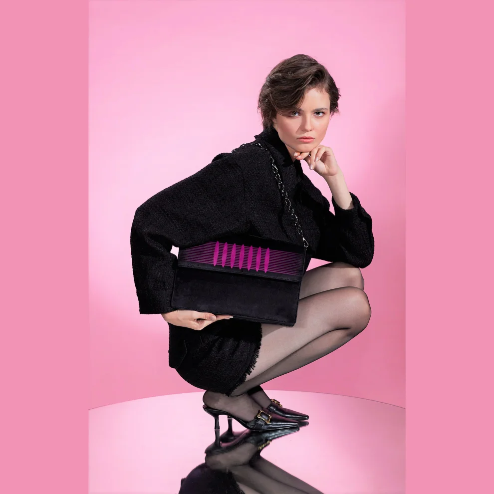 Black Colour Soft Velvet Fabric and Fuchsia Pattern.