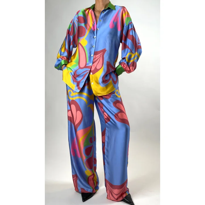 Palazzo Trousers, which are made of chiffon satin fabric that keeps light and cool, can be combined with a Long Kimono and Shirt