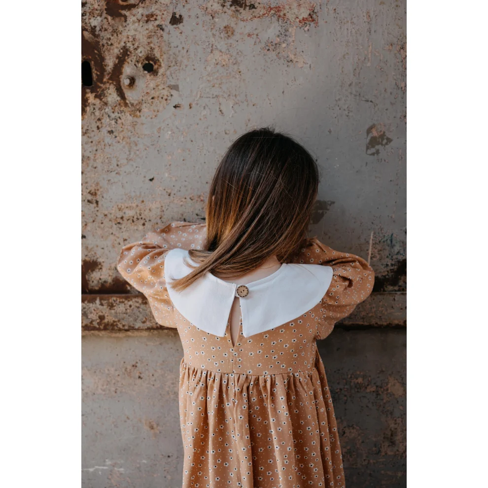 Powder floral fabric. Dress with white asymmetrical cut collar detail.