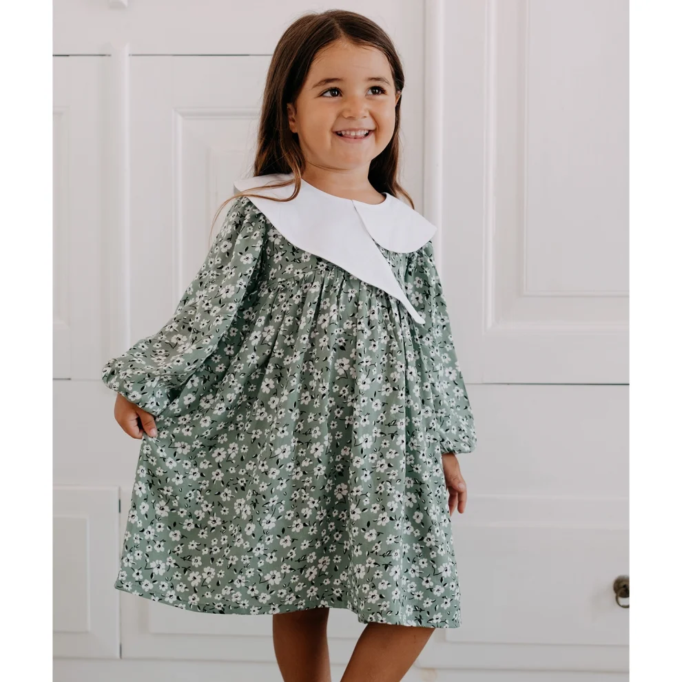 Mint floral embroidered fabric dress. White asymmetrical cut collar detail.