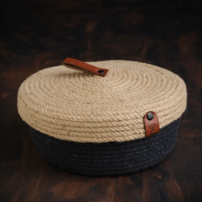 Stylish, decorative 100% handmade cotton rope basket in 20x8 sizes with jute lid that you can use as an organizer. You can use it in every area of your home, kitchen, bathroom, etc. to organize your belongings. Our products are made with high-quality genuine leather and eco-friendly materials. These unique products, designed by preserving the beauties of nature, offer you the perfect harmony of both elegance and naturalness.
