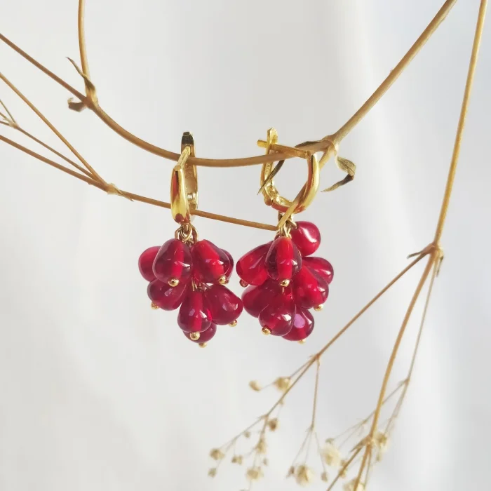Lampwork pomegranete seed earring. It is made flameworking glass technique and handmade one-of a kind piece. 22K gold plate on silver hoop.