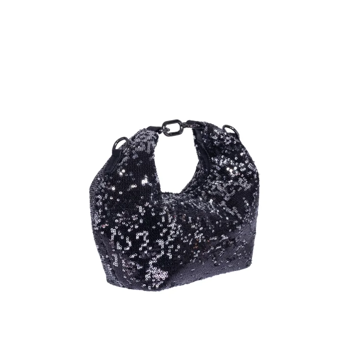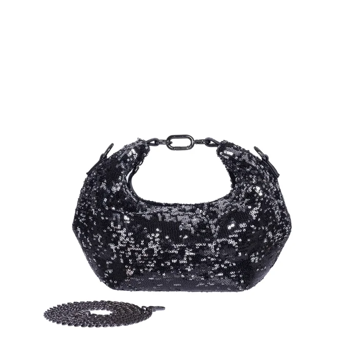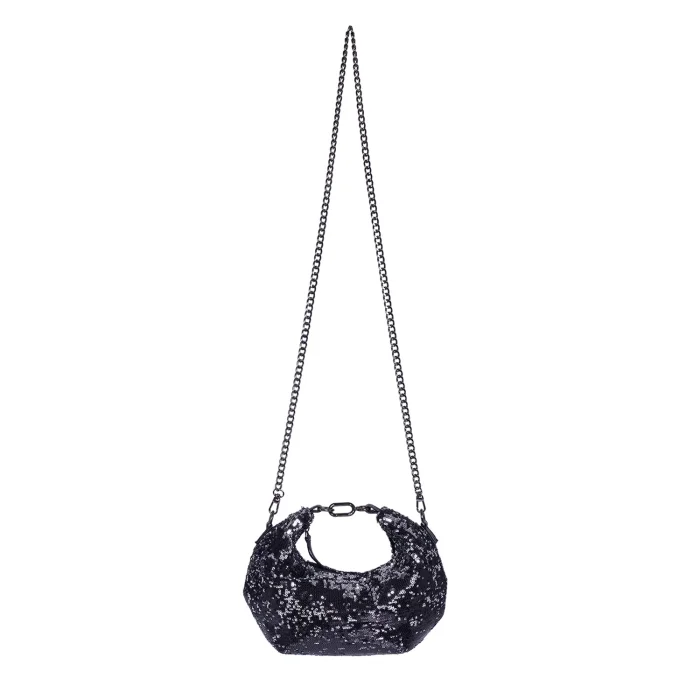 Stylish mini black/silver sequined ladies handbag. A chain strap is available for diagonal or shoulder use. Small daily necessities such as phone, wallet etc. can easily fit inside. Strap length 115cm.