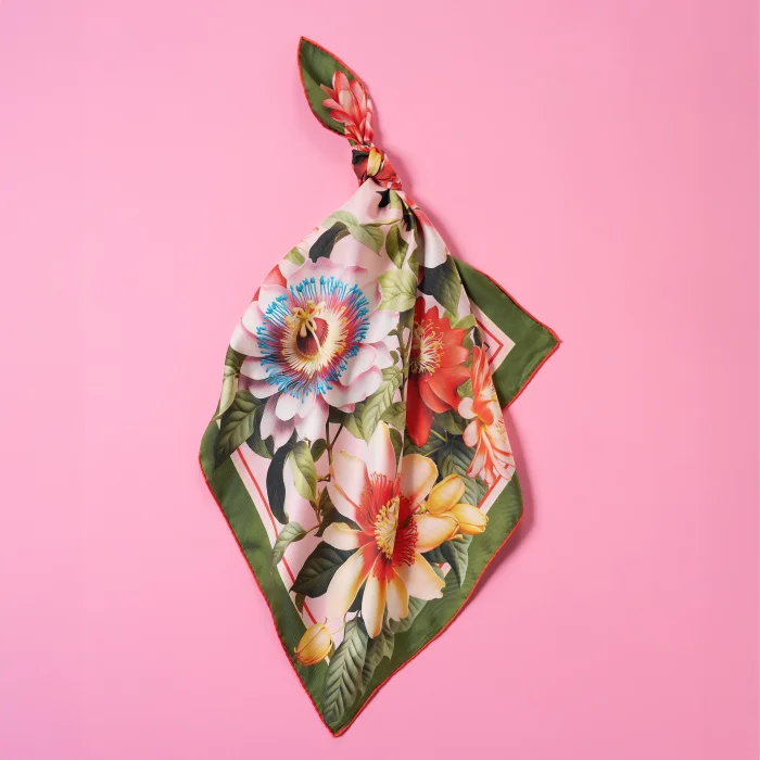 Material: 100% Twill Silk (14 mm) Edge Workmanship: Carefully hand-sewn by artisans. Pattern: Floral Size: 65x65 cm Usage: You can use it as a neck scarf, hair accessory, belt, bag or shoulder accessory.