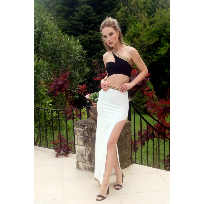 Elegance consisting of the up-and-down crepe harmony of black and white with gold details. The model in the image wears a size 36* Model Size Information Bust: 86-90cm Waist: 63-67cm Hips: 93-97cm