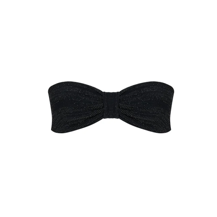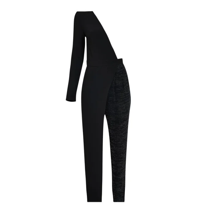 A bustier that shines with silver sparkle and an asymmetrical jumpsuit that meets the nobility of black.