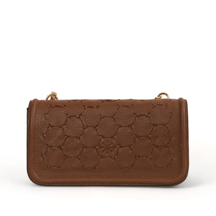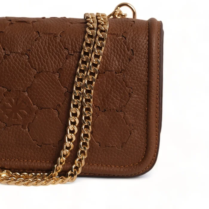 The interior is lined with recycled polyester and includes a zippered pocket and phone case. The hand-knitted body adds a unique touch to this versatile bag. The chain handle can be hung on the shoulder as a double layer or diagonally as a single layer. Width: 23 cm Height: 12 cm Depth: 6cm Chain handle length at shoulder strap: 27 cm Chain handle length hanging diagonally: 50 cm