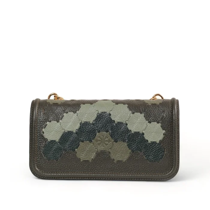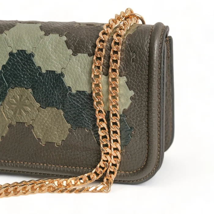 The interior is lined with recycled polyester and includes a zippered pocket and phone case. The hand-knitted body adds a unique touch to this versatile bag. The chain handle can be hung on the shoulder as a double layer or diagonally as a single layer. Width: 23 cm Height: 12 cm Depth: 6cm Chain handle length at shoulder strap: 27 cm Chain handle length hanging diagonally: 50 cm