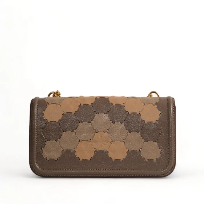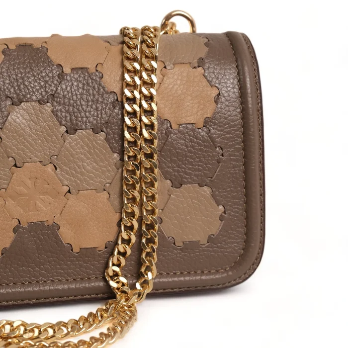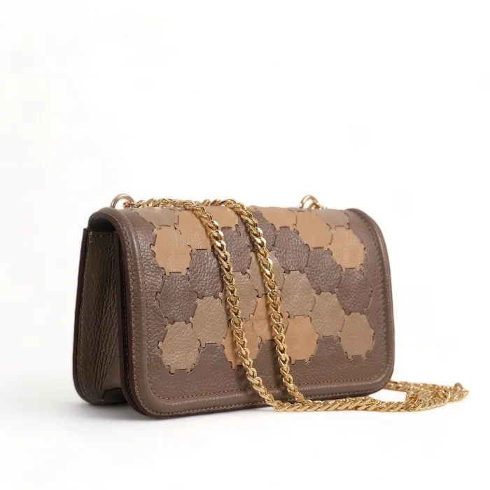 The interior is lined with recycled polyester and includes a zippered pocket and phone case. The hand-knitted body adds a unique touch to this versatile bag. The chain handle can be hung on the shoulder as a double layer or diagonally as a single layer. Width: 23 cm Height: 12 cm Depth: 6cm Chain handle length at shoulder strap: 27 cm Chain handle length hanging diagonally: 50 cm