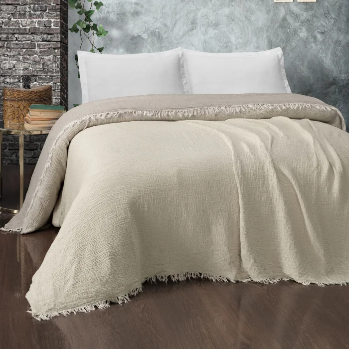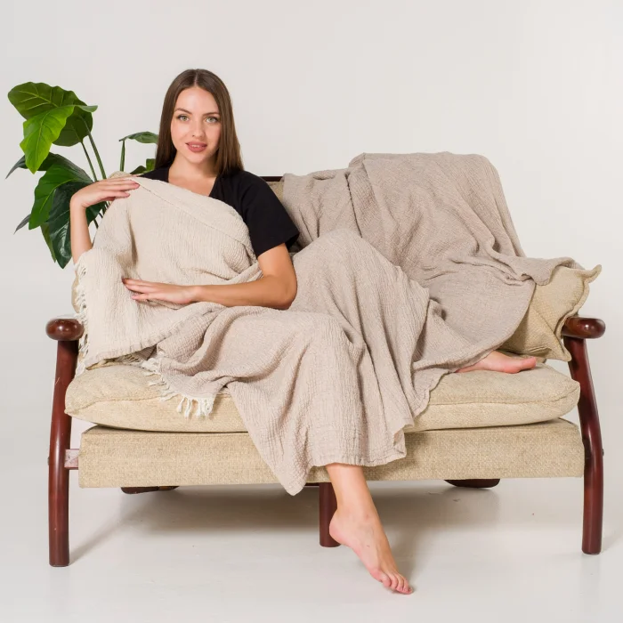 Our 3-layer double-sided breathable crepe muslin, produced from organic 100% Turkish cotton, is used for 4 seasons as a bed shawl, sofa shawl, TV blanket, pique with its soft texture produced with a very special weaving technique.