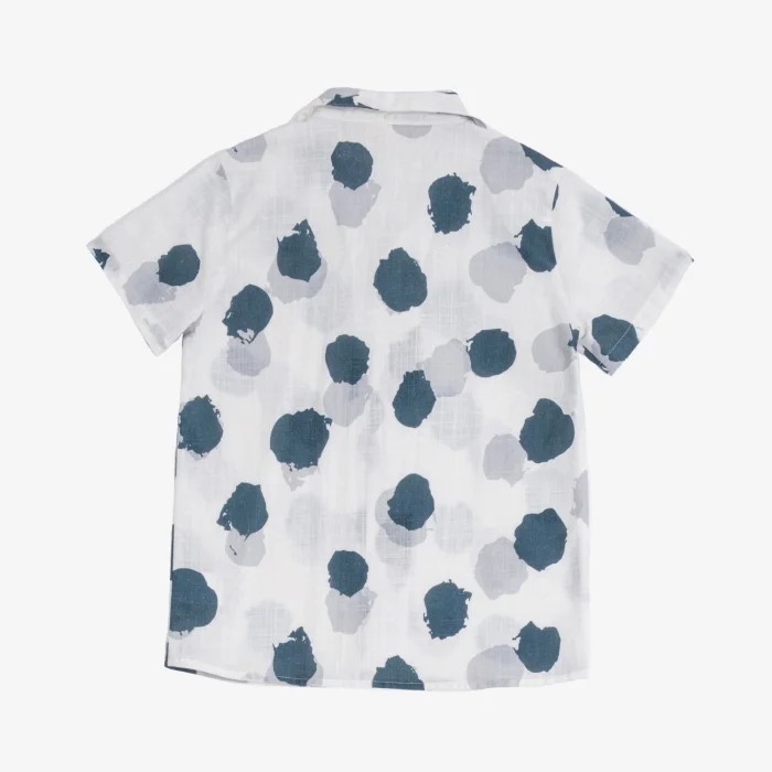 The Radoxo shirt has a water-based screen pattern in dark blue and light blue tones. It is made of 100% cotton woven fabric, making it both durable and soft. Its short-sleeved design is ideal for the summer months, providing coolness and comfort to children.